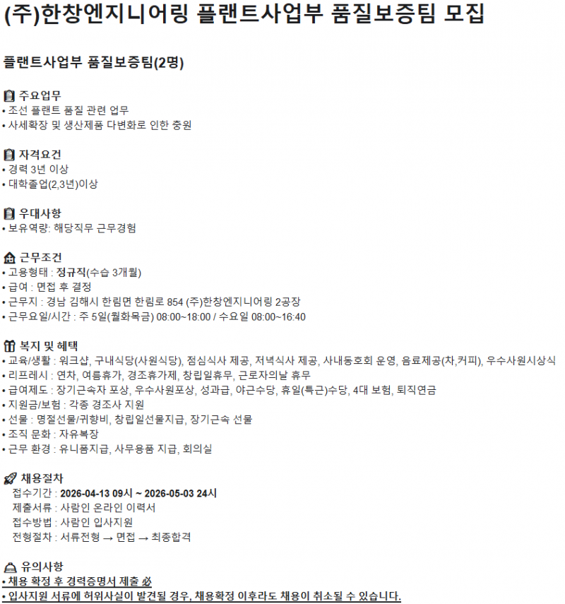 플랜트사업부 품질보증팀 경력사원 모집관리자작성일 26-04-03 09:59
